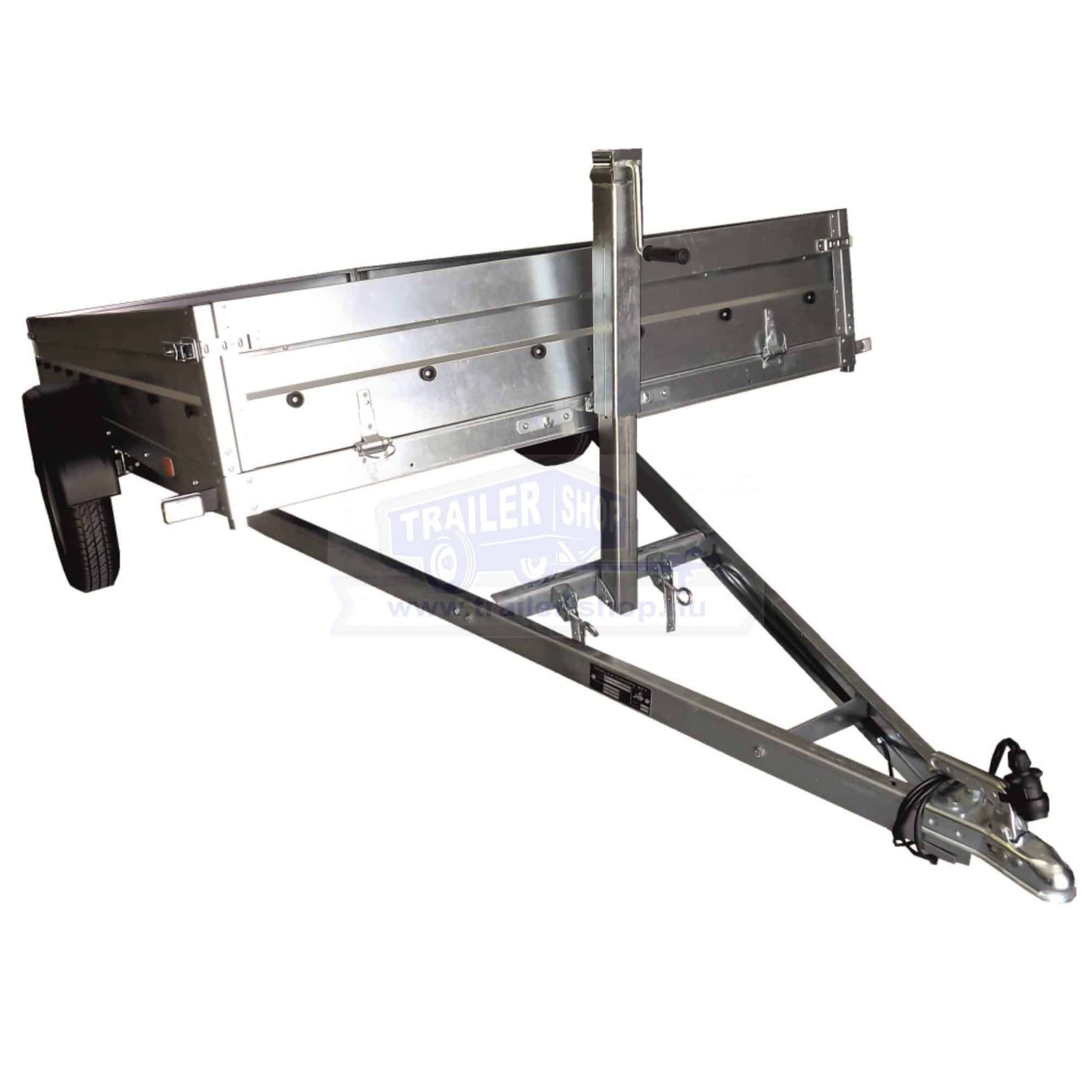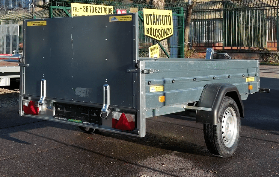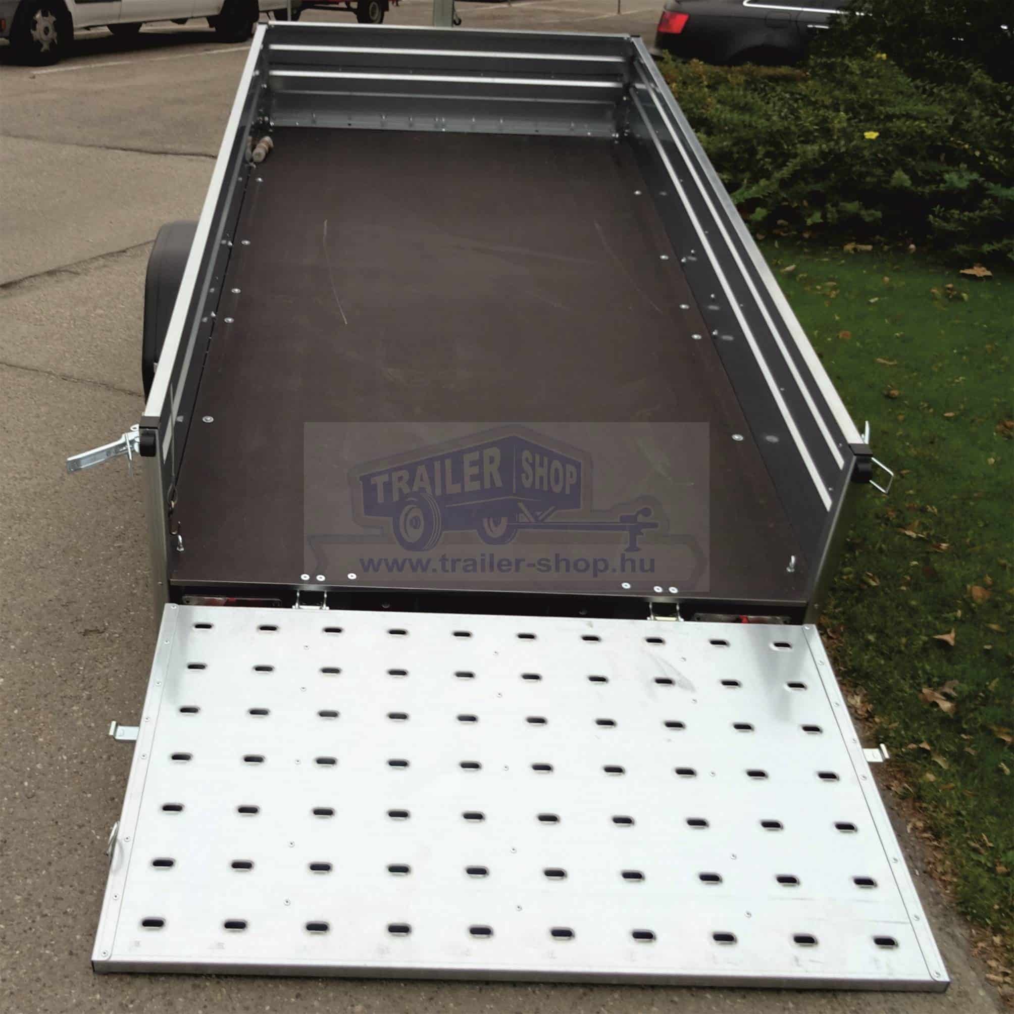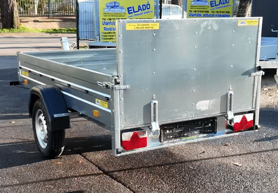 Az utánfutó alvázát megbízható Knott gyártmányú torziós tengely alkotja. A kerékméret 155/70 R13, amely megfelelő stabilitást és terhelhetőséget biztosít. A szállítófelület erős, vízálló és csúszásmentes rétegelt falemez, integrált rögzítő elemekkel így a rakomány mindig biztonságban van. A V-típusú vonórúd biztos vontatási stabilitást nyújt menet közben. Az oldalfalak teljes egészében horganyzott acélból készülnek, bordázott kialakításuknak köszönhetően merev fallal ellenáll a a deformálódásnak. Nyitható hátsó oldala van, ami pár perc alatt lehetővé teszi a be- és kirakodást! Az oldalfalak magassága 35 cm, de kérhető akár 70 cm teljes magasságban is.