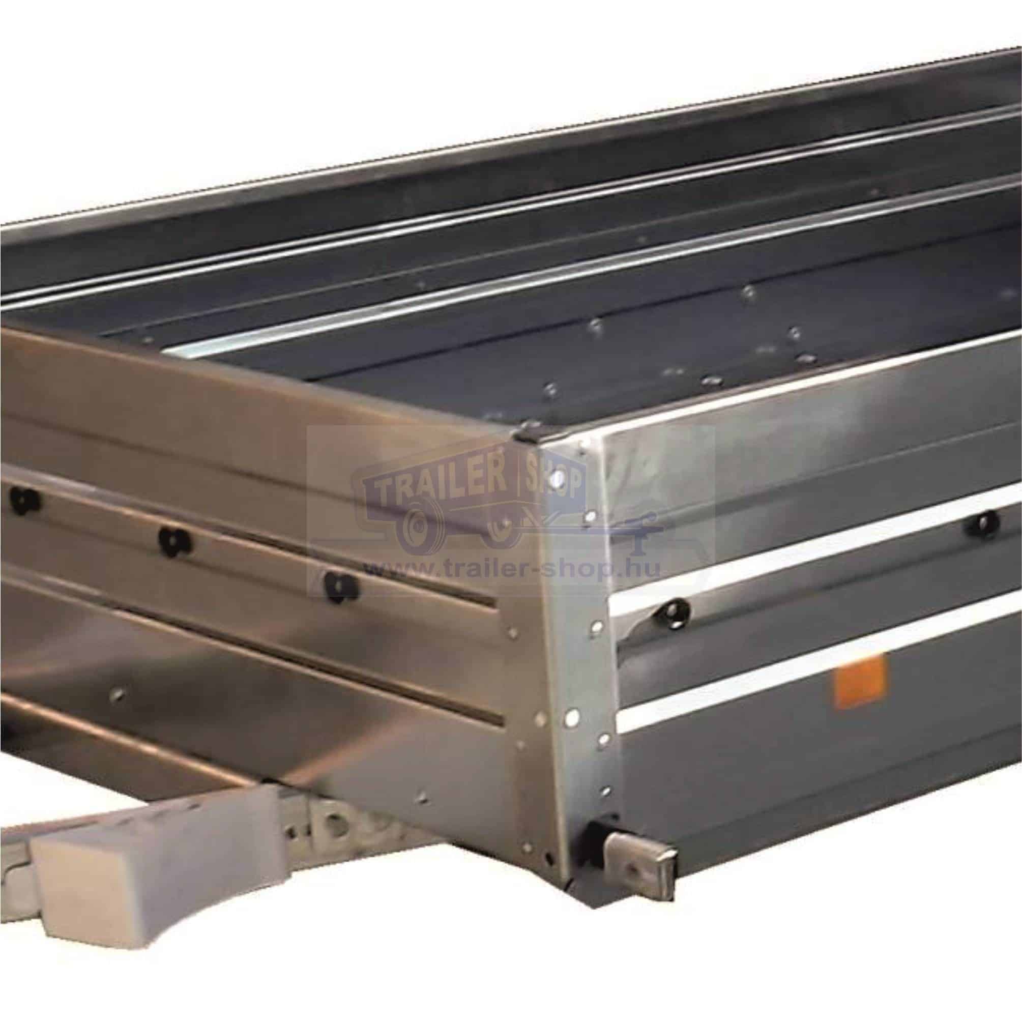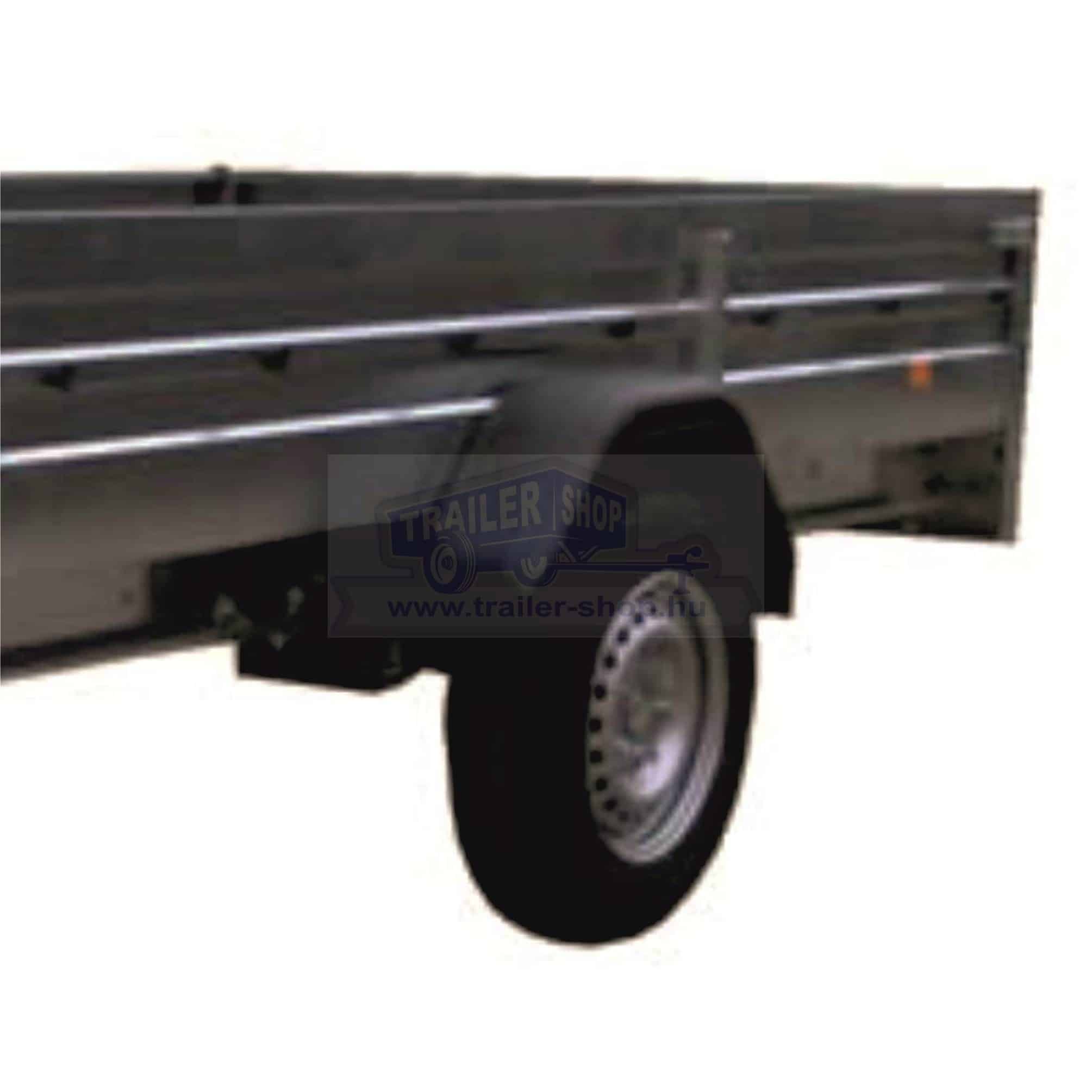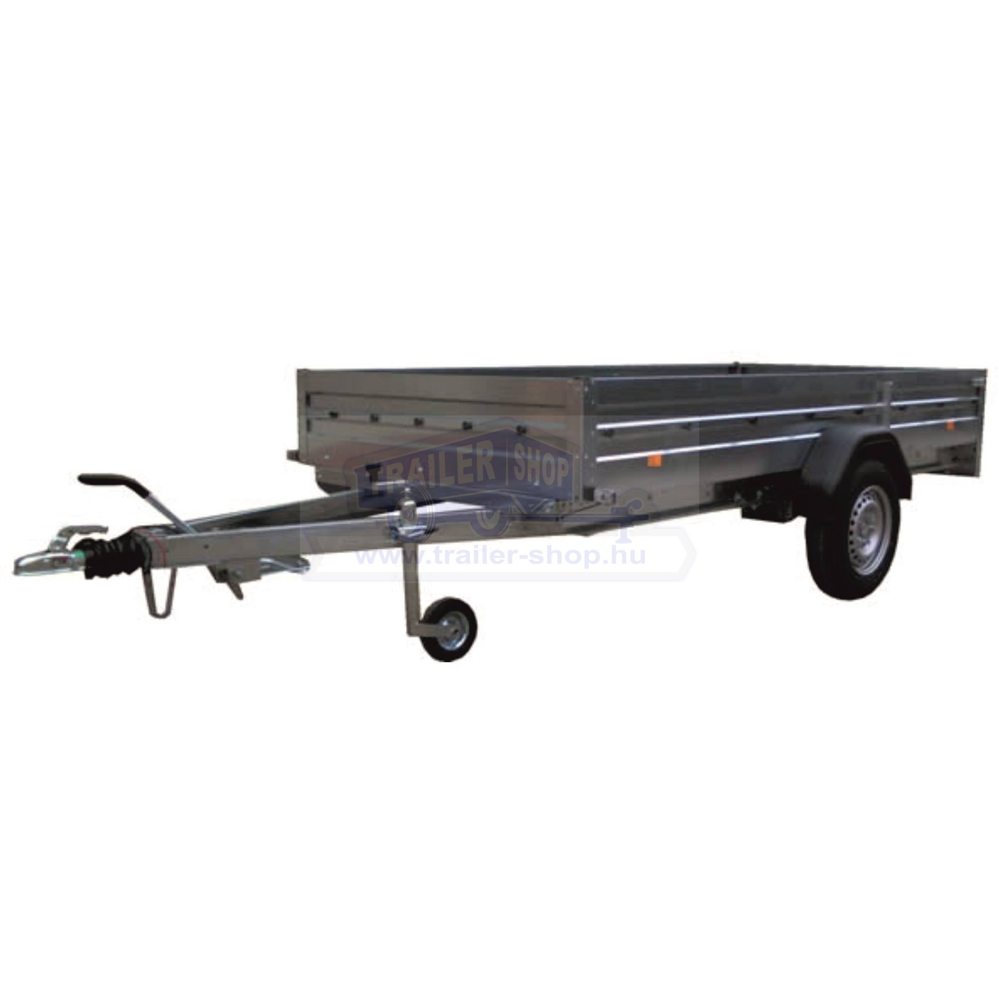 Az utánfutó alvázát megbízható Knott gyártmányú torziós tengely alkotja. A kerékméret 155/70 R13, amely megfelelő stabilitást és terhelhetőséget biztosít. A szállítófelület erős, vízálló és csúszásmentes rétegelt falemez, integrált rögzítő elemekkel így a rakomány mindig biztonságban van. A V-típusú vonórúd biztos vontatási stabilitást nyújt menet közben. Az oldalfalak teljes egészében horganyzott acélból készülnek, bordázott kialakításuknak köszönhetően merev fallal ellenáll a a deformálódásnak. Nyitható hátsó oldala van, ami pár perc alatt lehetővé teszi a be- és kirakodást! Az oldalfalak magassága 35 cm, de kérhető akár 70 cm teljes magasságban is.