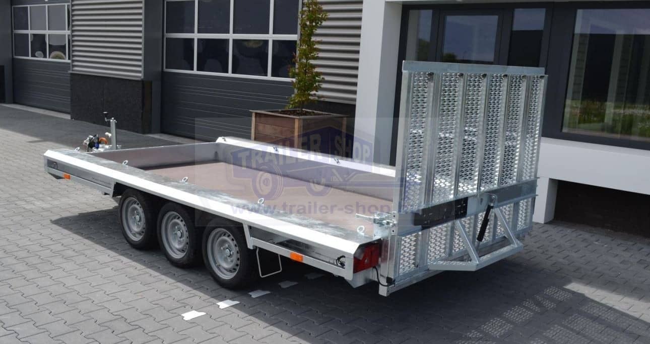 Kéttengelyes, fékezett, alsókerekes, gépszállító utánfutó, trailer felhajtó rámpával, a 130 cm-es rámpahossz minimális dőlésszöget biztosít a gépkocsi gépszállítóra való felhajtásához