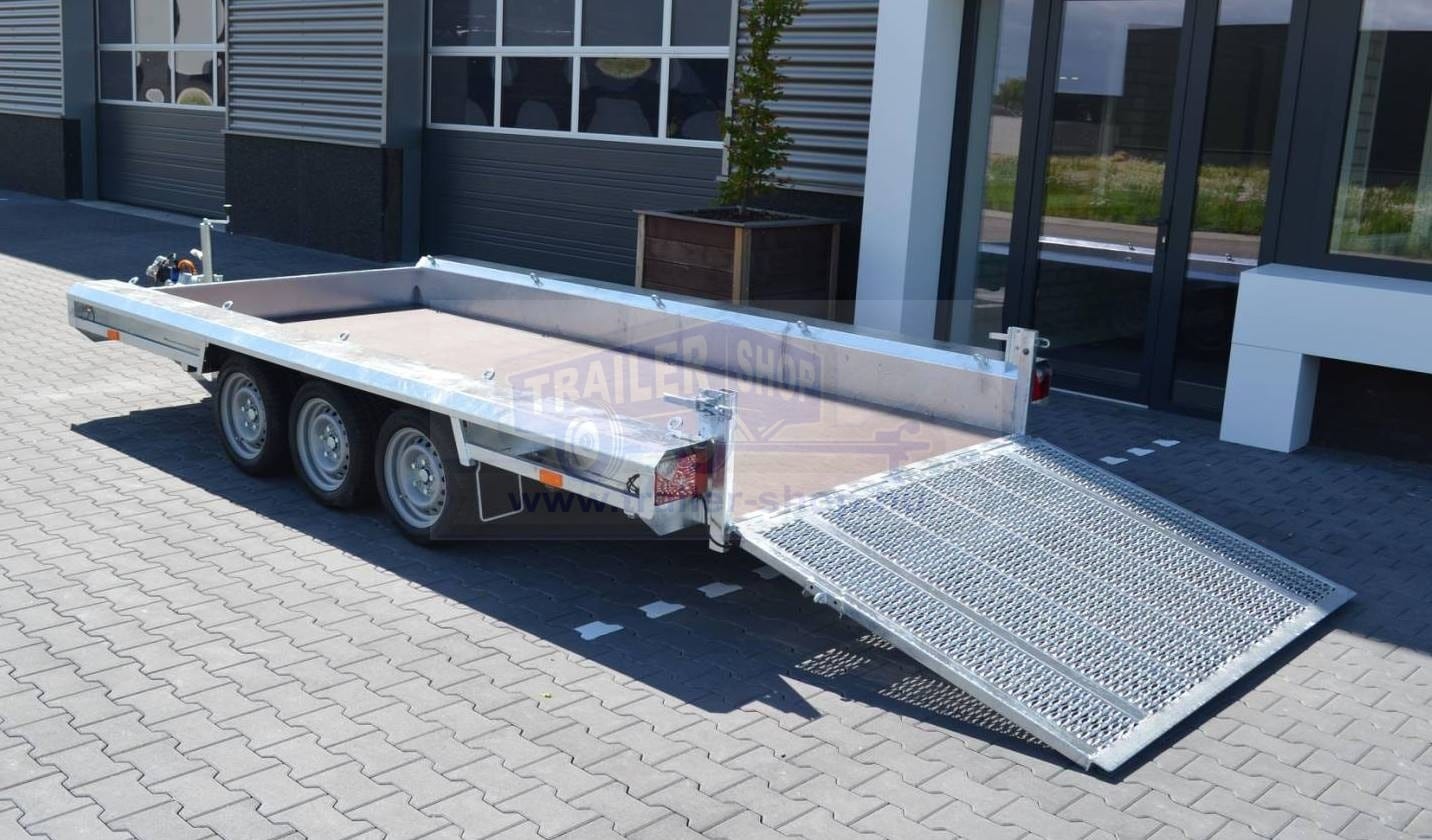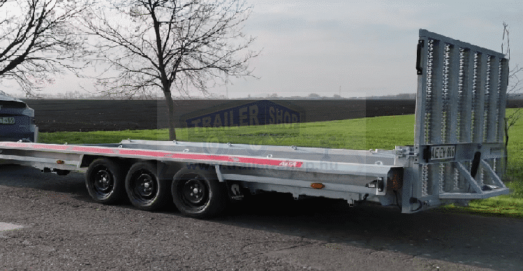 Kéttengelyes, fékezett, alsókerekes, gépszállító utánfutó, trailer felhajtó rámpával, a 130 cm-es rámpahossz minimális dőlésszöget biztosít a gépkocsi gépszállítóra való felhajtásához.