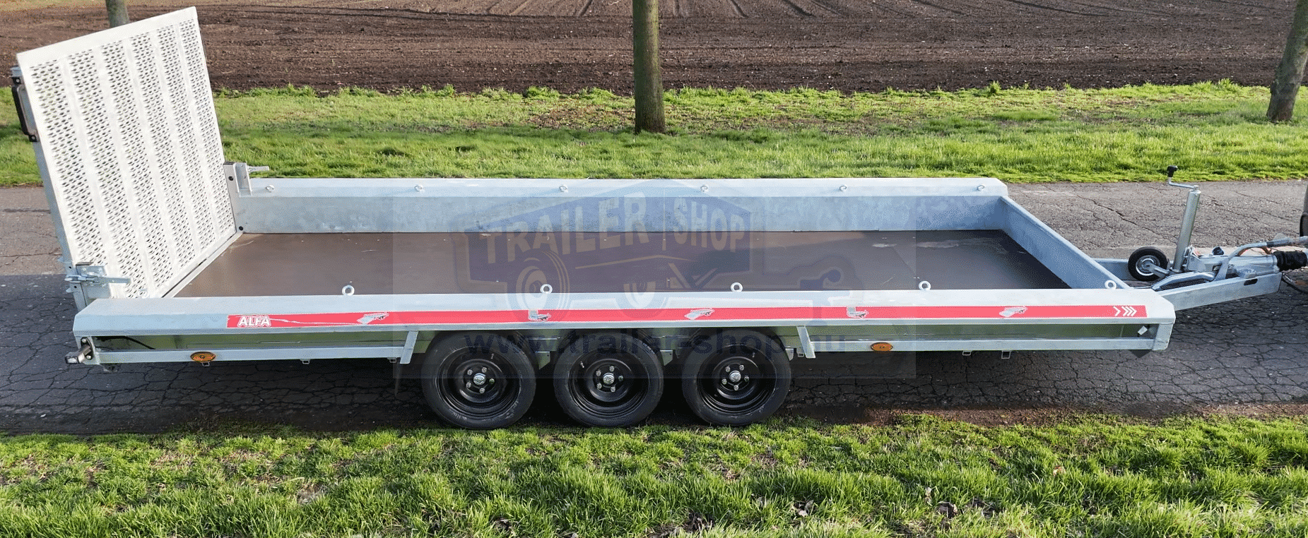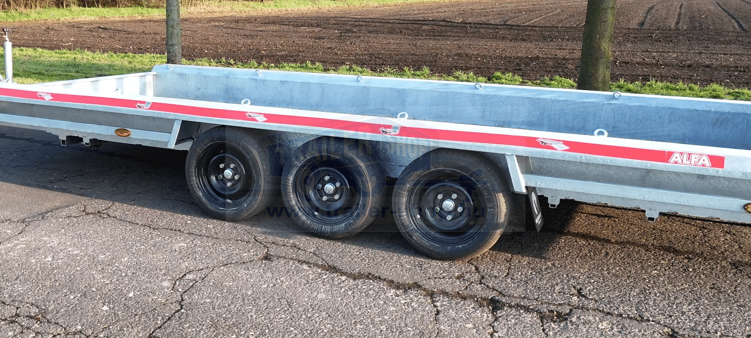 Az utánfutó alvázát megbízható Knott gyártmányú torziós tengelyek alkotják. A kerékméretek: 10 és 13 col , amely megfelelő stabilitást és terhelhetőséget biztosít. A szállítófelület erős, vízálló és csúszásmentes rétegelt falemez, integrált rögzítő elemekkel így a rakomány mindig biztonságban van. A V-típusú vonórúd biztos vontatási stabilitást nyújt menet közben. Az Alfa gépszállító utánfutó erős, két-és háromtengelyes, fékezett kivitel, amely munkagépek és nehéz eszközök szállítására készült. Hasznos raktérhossza 4–4,5 méter, teherbírása típustól függően akár 2700 kg is lehet. A felhajtást csúszásmentes acélrámpák segítik, a biztonságos szállítást több rögzítési pont és alacsony rakodómagasság biztosítja.