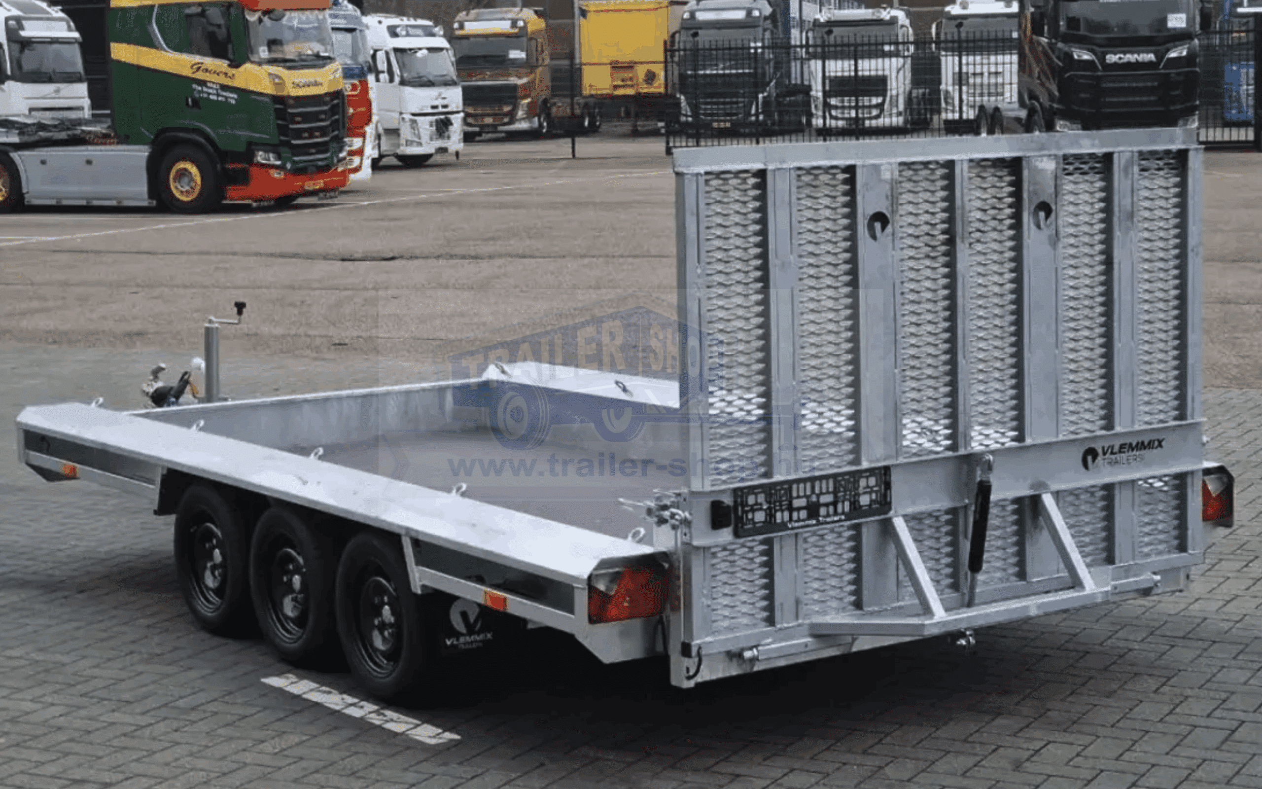 ALFA-T (VLEMMIX) 64818MVG.350/T háromtengelyes, fékezett, alsókerekes, síkplatós, gépszállító utánfutó, tréler felhajtó rámpával