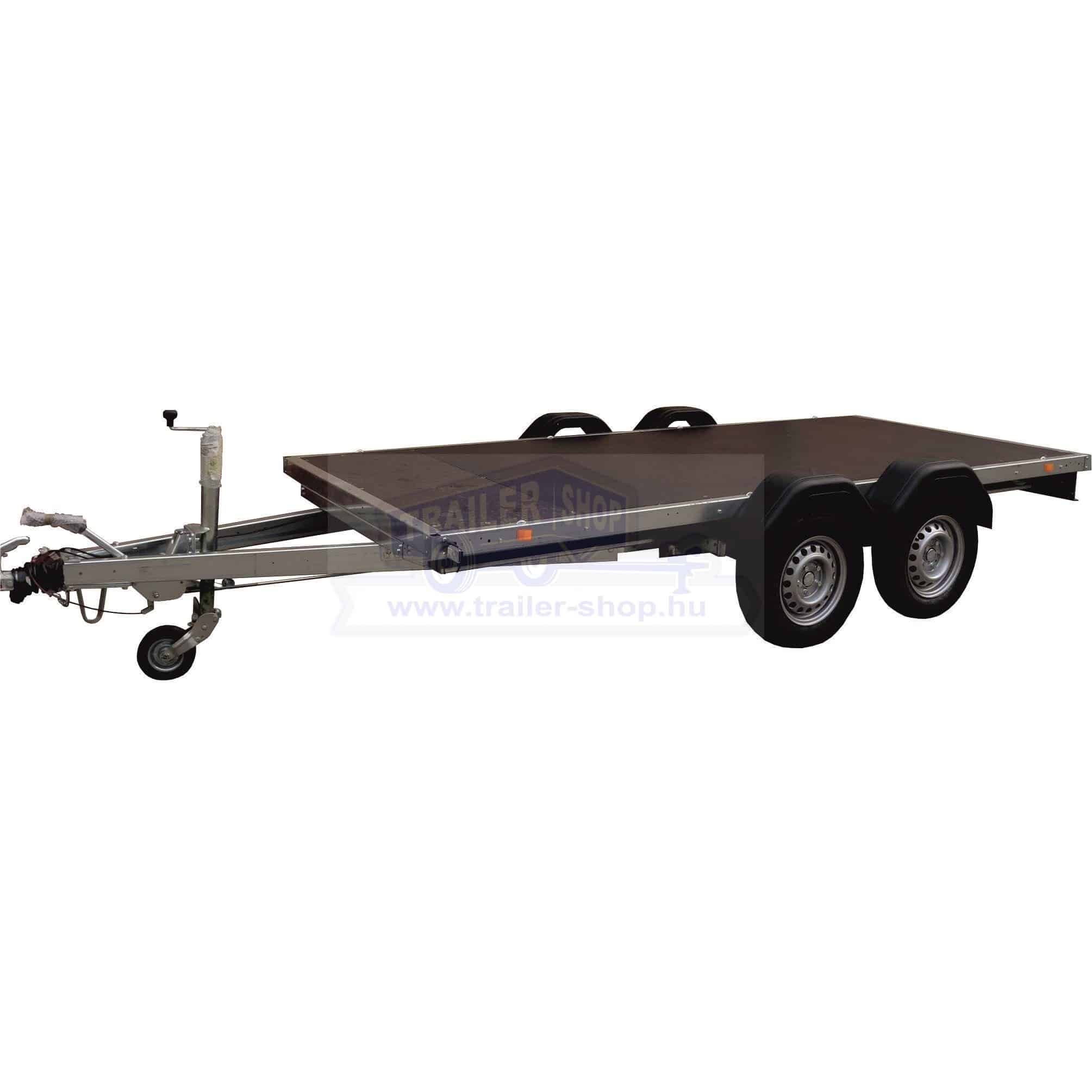 ALFA-T 42516MP.270-ig kéttengelyes, 2,56×1,6m méretű, 2700kg,fékezett, mellsőkerekes, síkplatós, uniplatós utánfutó